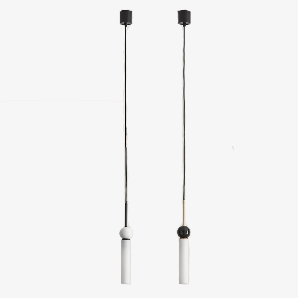 Colgante de techo con esfera de mármol y tulipa cilíndrica de la firma Aromas del Campo.